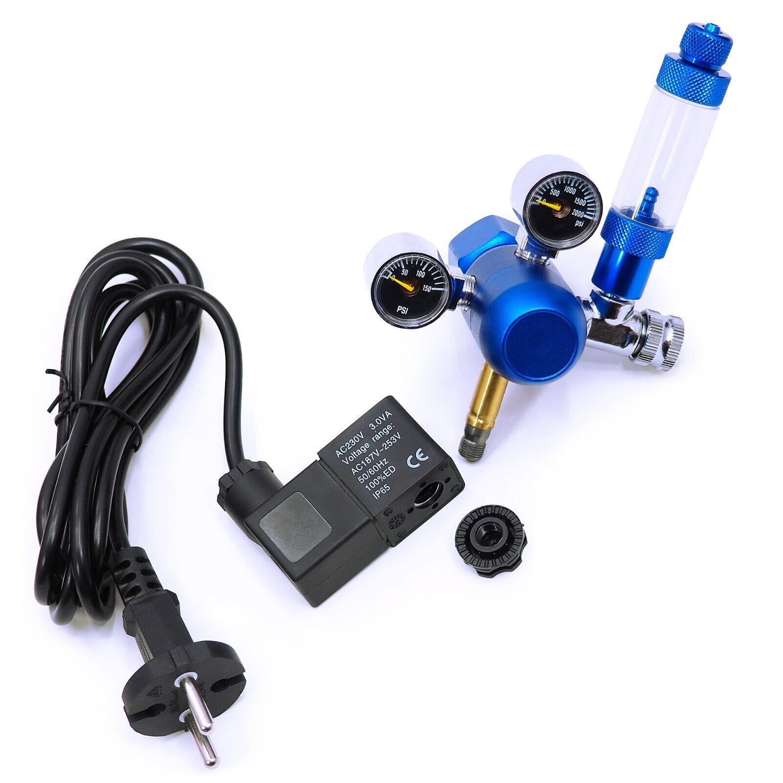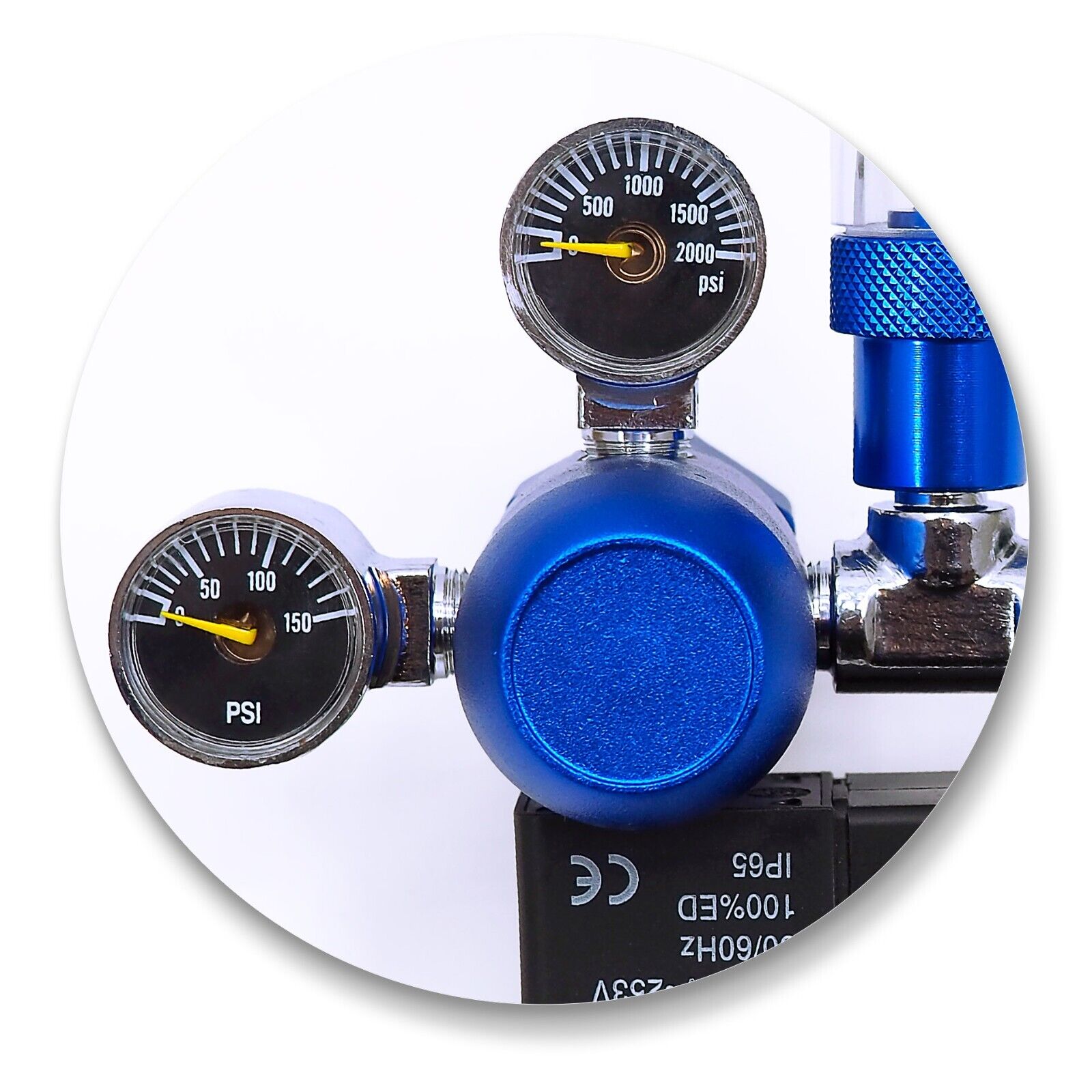 Der Regler ist mit 2 Manometern (Hoch- und Niederdruck), einem Blasenzähler, einem Elektroventil und einem Sicherheitsventil ausgestattet.
