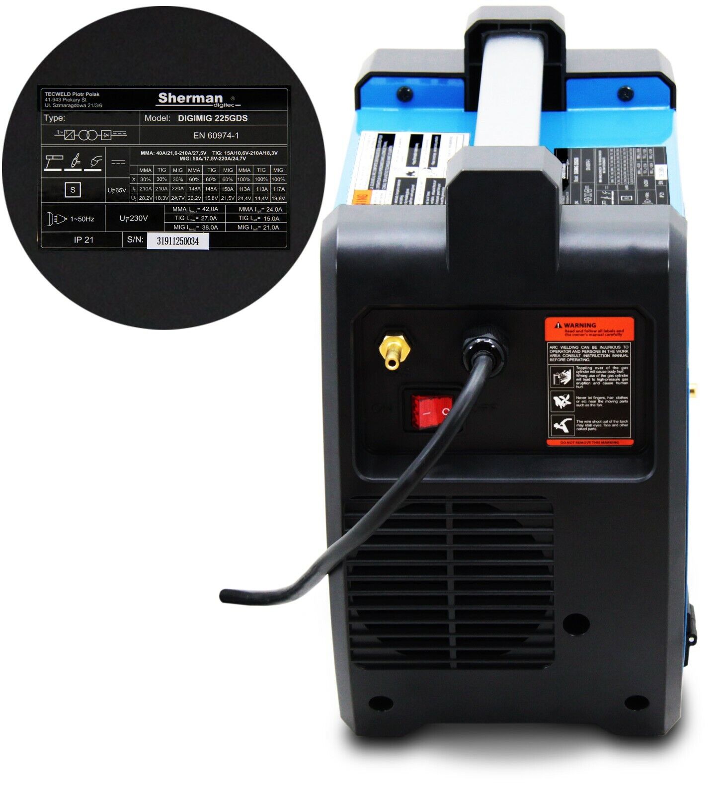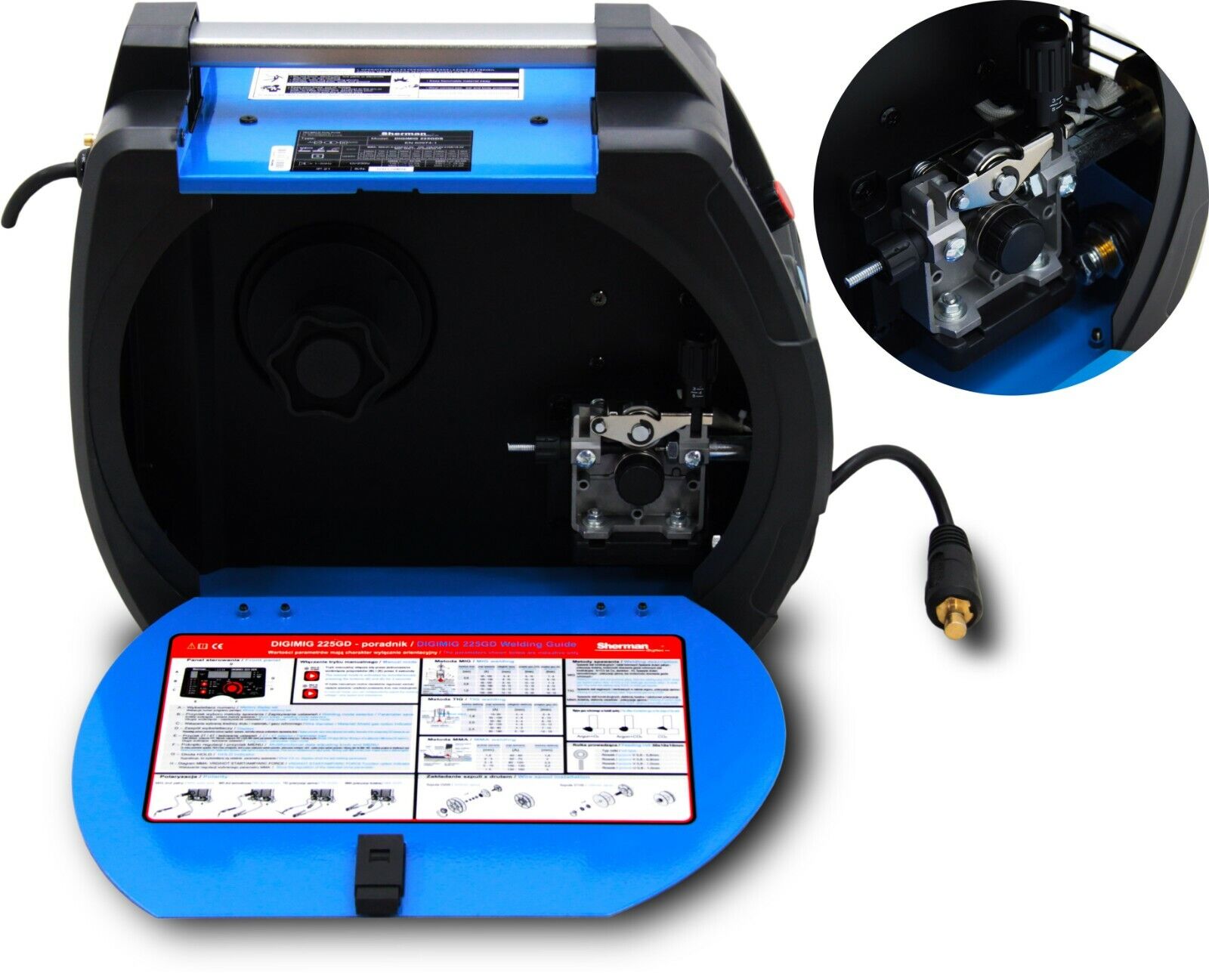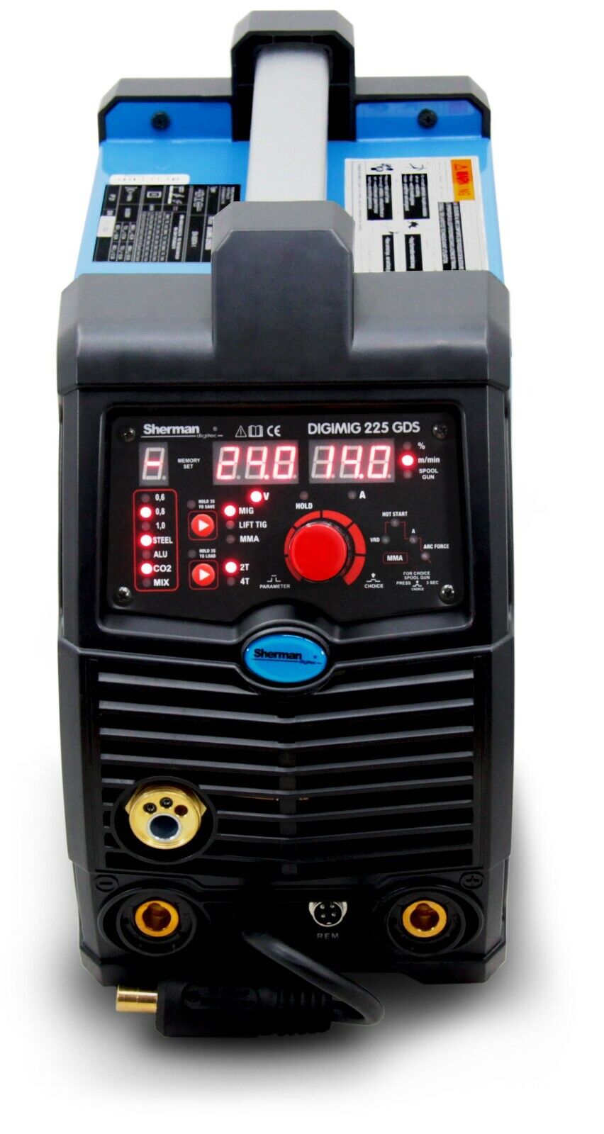 Das synergetische Schweißgerät SHERMAN DIGIMIG 225GDS ist das innovativste Gerät auf dem europäischen Markt für das manuelle Schweißen von Stahl und Nichteisenmetallen mit den Verfahren MIG/MAG, MMA (umhüllte Elektrode) und Lift TIG. Das Gerät kann auch zum Löten von CUSI3 dünnen (bis zu 3 mm) verzinkten Blechen verwendet werden.