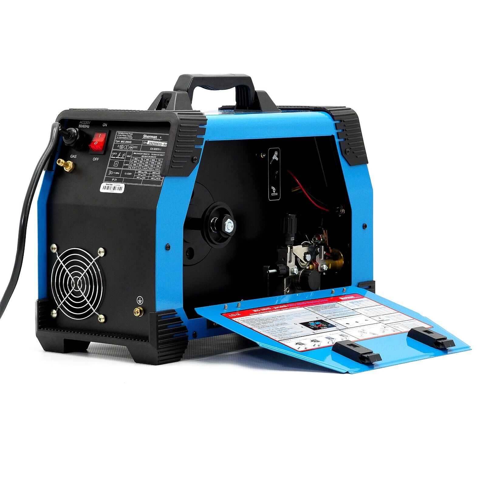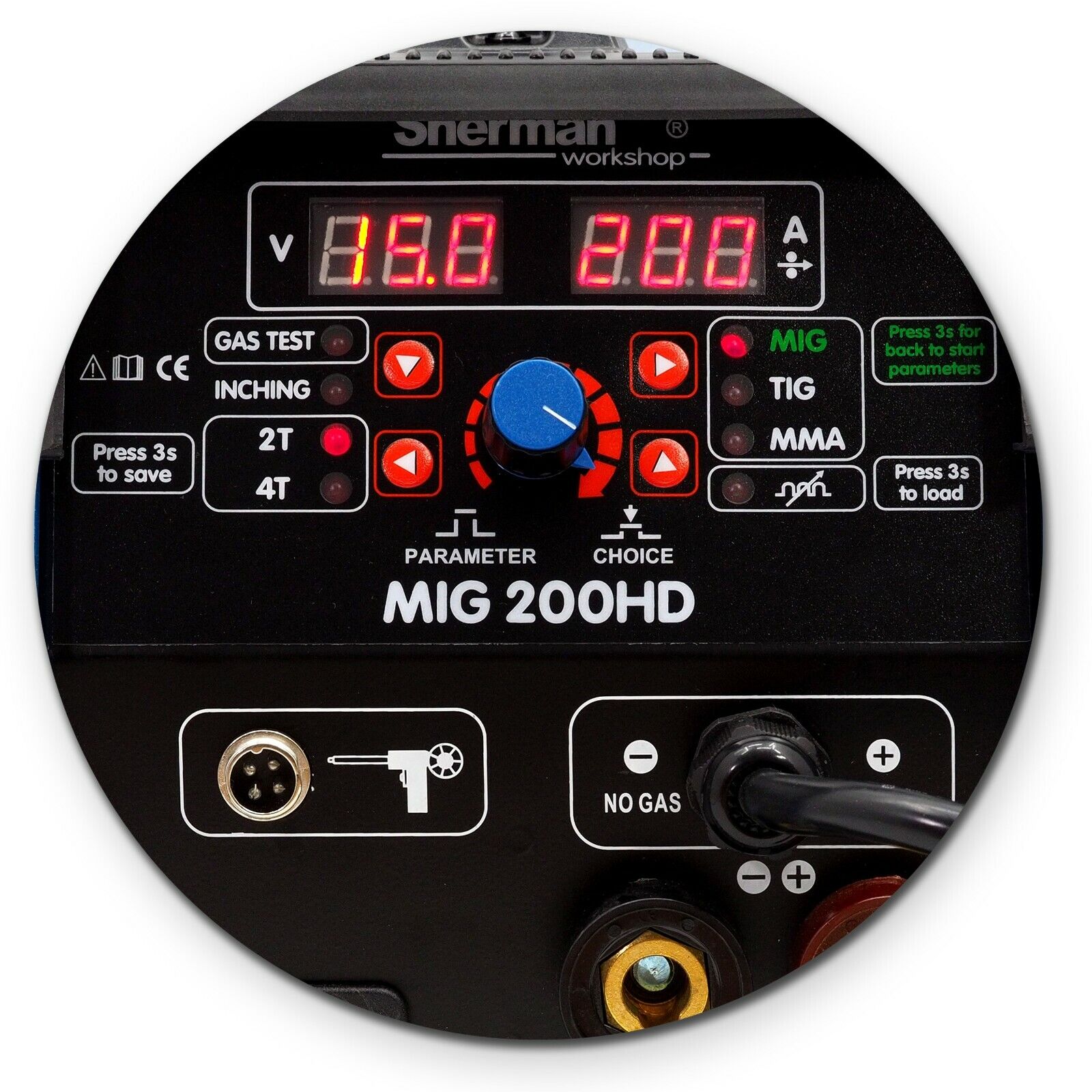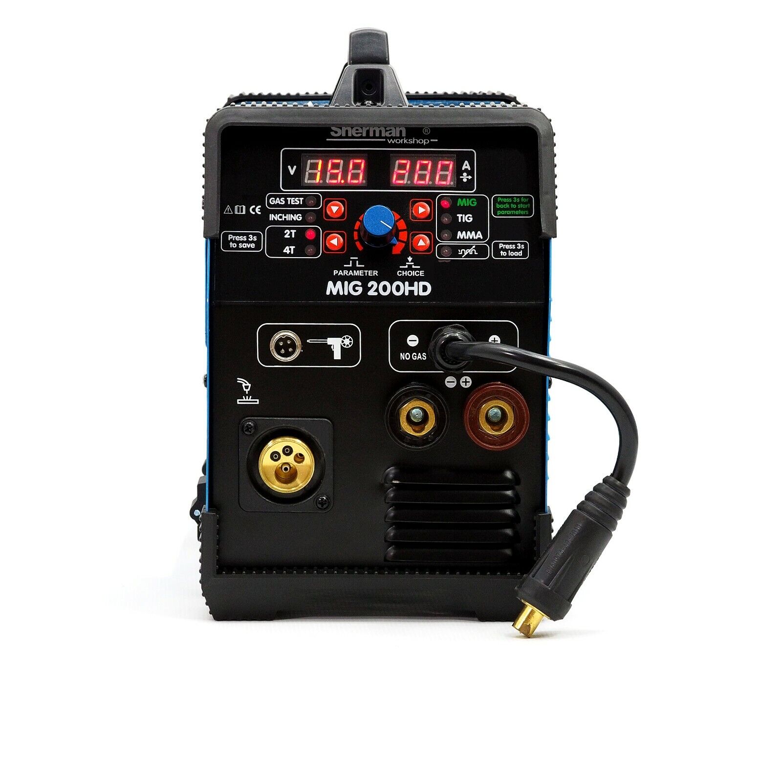 Das Sherman MIG 200 HD Inverter-Schweißgerät ist ein sehr einfach zu bedienendes MIG/MAG-Schweiß-Shuttle mit MMA-Option und WIG-Hub, das mit einem maximalen Strom von 200A schweißen kann. Es ist die beste Wahl für diejenigen, die ihr erstes MIG/MAG-Gerät suchen, sowie für Werkstatt- und Serviceanwendungen. Das Gerät verfügt über viele Annehmlichkeiten in Form von programmierbaren Speicherkanälen, der Verwendung der Spulenpistolenhalterung oder der Synergie, die den Drahtvorschub an den voreingestellten Schweißstrom anpasst.